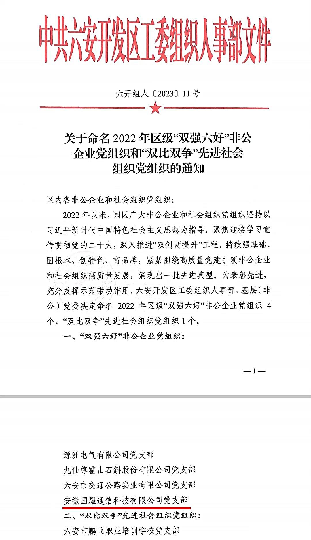 近日,中共六安開發(fā)區(qū)工委下發(fā)了《關(guān)于命名2022年區(qū)級(jí)“雙強(qiáng)六好”非公企業(yè)黨組織和“雙比雙爭”先進(jìn)社會(huì)組織黨組織的通知》,其中,安徽國耀通信科技有限公司黨支部獲評(píng)“‘雙強(qiáng)六好’非公企業(yè)黨組織”。