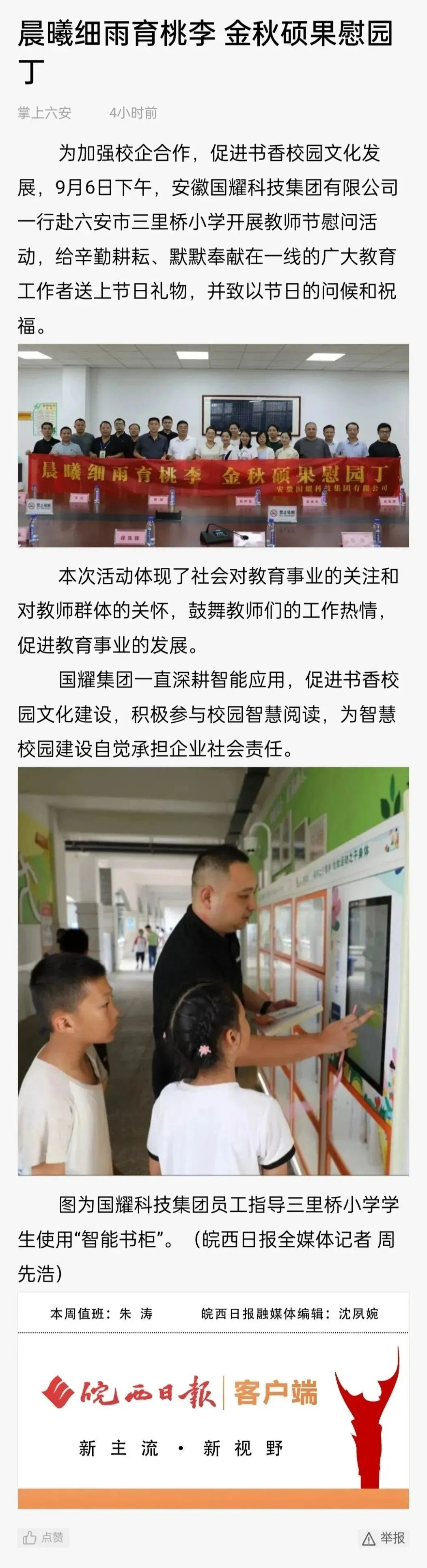在第39個(gè)教師節(jié)來臨之際,為弘揚(yáng)尊師重教的優(yōu)良傳統(tǒng),向社會(huì)傳遞對(duì)教育的重視和支持,安徽國(guó)耀科技集團(tuán)有限公司一行赴六安市三里橋小學(xué)開展“晨曦細(xì)雨育桃李,金秋碩果慰園丁”教師節(jié)主題活動(dòng)。