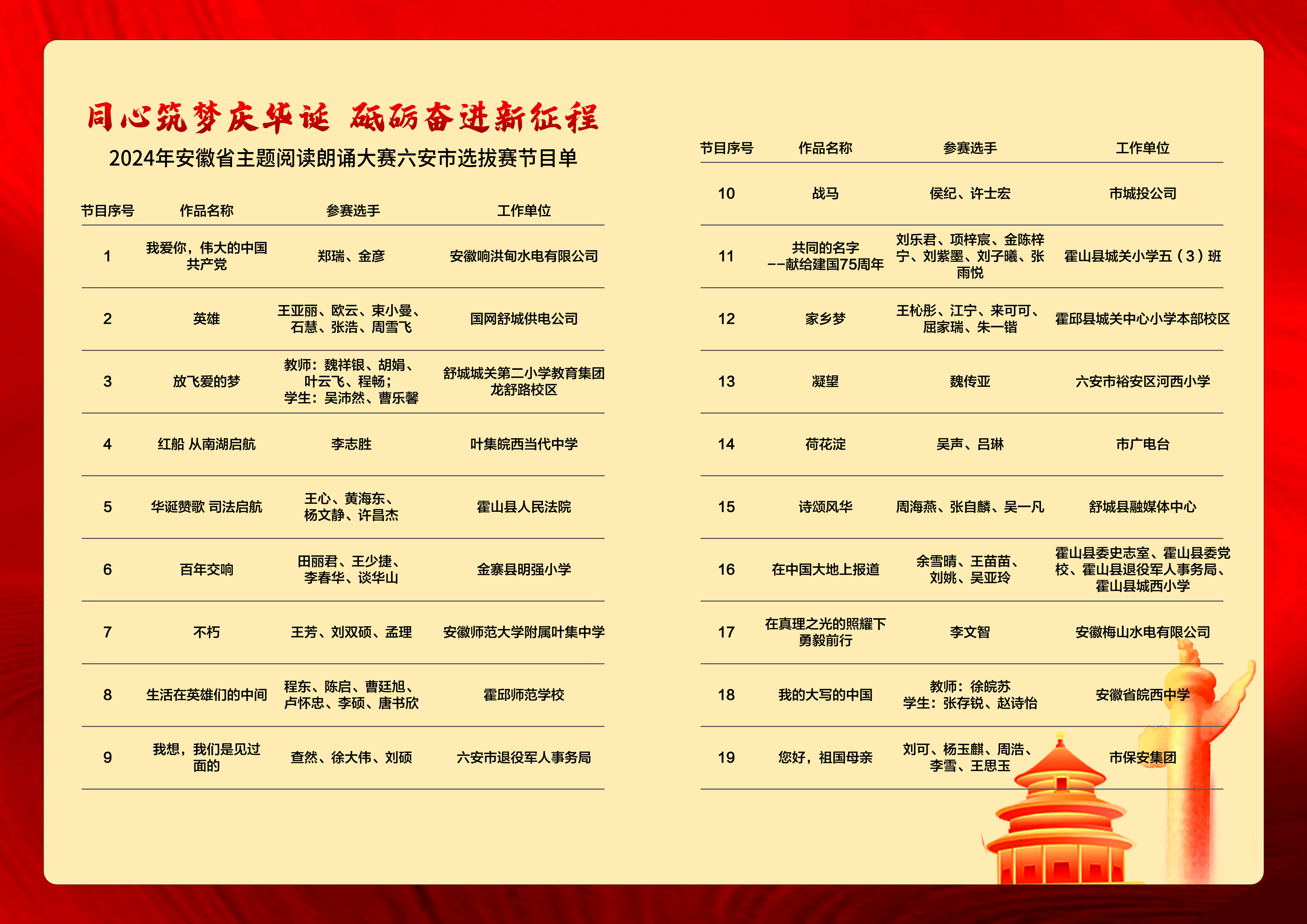 凝心聚偉力,奮進(jìn)譜華章。本次“同心筑夢慶華誕 砥礪奮進(jìn)新征程”2024年安徽省主題閱讀朗誦大賽六安市選拔賽,牢牢把握習(xí)近平新時代中國特色社會主義思想,朗誦內(nèi)容積極向上、催人奮進(jìn),展現(xiàn)了六安市人民奮發(fā)昂揚的精神風(fēng)貌。七十五載偉大征程,百年初心歷久彌堅。希望以此次活動為契機(jī),進(jìn)一步推動書香六安建設(shè),推廣全民閱讀,用書香涵養(yǎng)文明中國,為祖國75周年華誕深情獻(xiàn)禮。