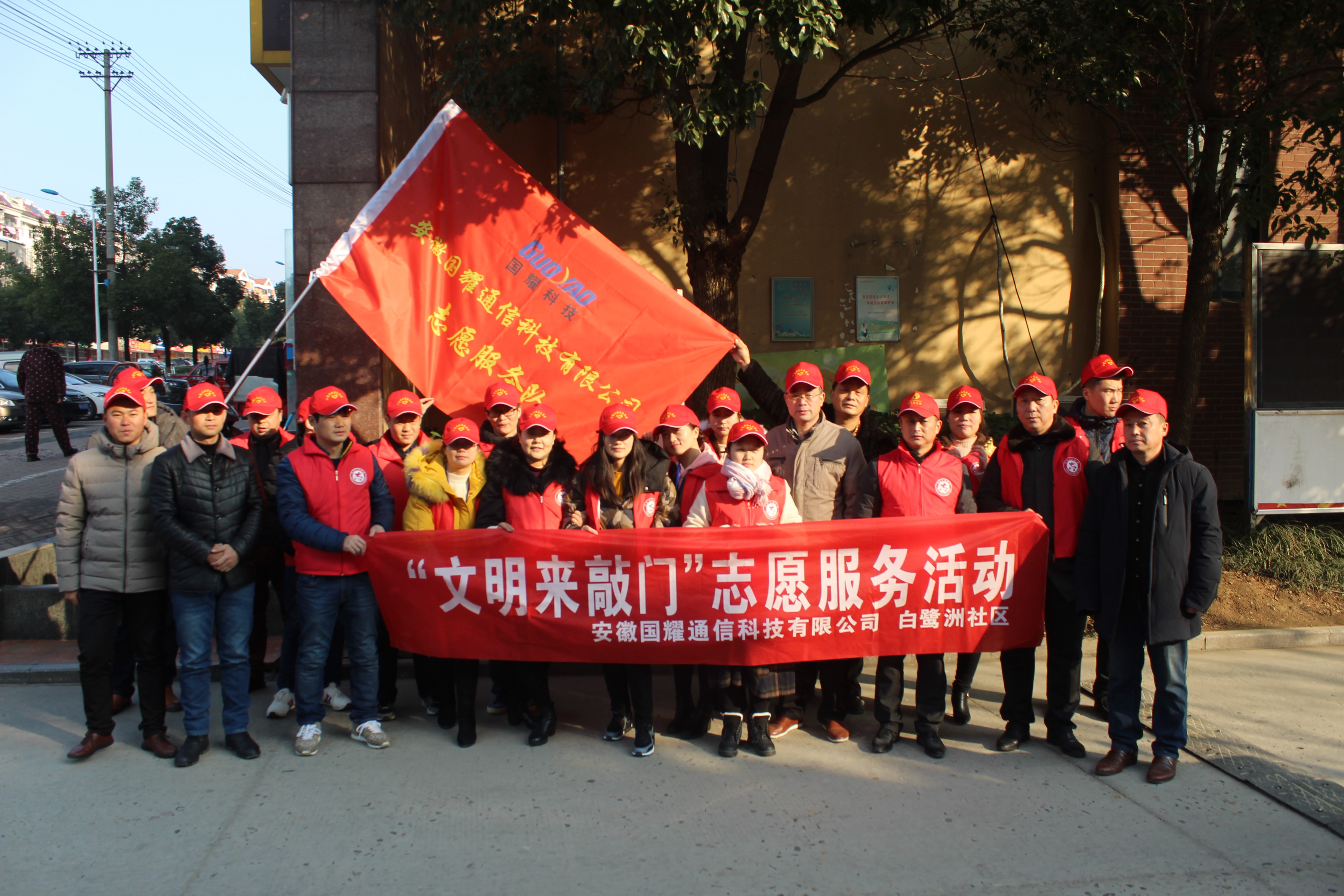 2018年12月13日下午,安徽國(guó)耀通信科技有限公司志愿服務(wù)隊(duì)聯(lián)合白鷺洲社區(qū)志愿者,深入香榭花城小區(qū)開(kāi)展“文明來(lái)敲門”志愿服務(wù)活動(dòng)。