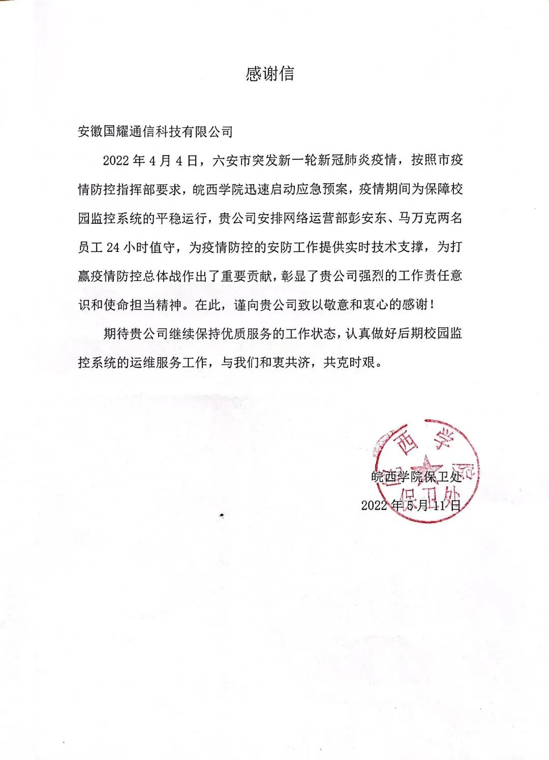 2022年5月1日,六安市金安區(qū)、裕安區(qū)事務(wù)管理服務(wù)中心,皖西學(xué)院,金安區(qū)文化和旅游局對(duì)國耀公司在抗疫期間參與的各項(xiàng)工作給予肯定,為我司頒發(fā)錦旗,并頒發(fā)抗疫人員榮譽(yù)證書,高度贊揚(yáng)國耀公司員工面對(duì)風(fēng)險(xiǎn)不退縮、不畏懼,堅(jiān)守崗位,共克時(shí)艱,保障了疫情防控期間工作的順利開展。