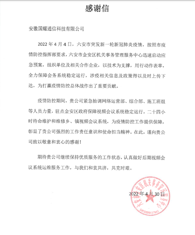 自2022年4月4日六安市新冠肺炎疫情發(fā)生以來,安徽國耀通信科技有限公司聞令出動(dòng)、聽令而行,積極配合上級(jí)部門開展各項(xiàng)疫情防控工作,同時(shí)安排國耀公司網(wǎng)絡(luò)運(yùn)營部、綜合管理部及施工班組等人員,支援金安區(qū)、裕安區(qū)機(jī)關(guān)事務(wù)管理服務(wù)中心視頻會(huì)議保障等工作,危難時(shí)刻,挺身而出,連續(xù)堅(jiān)守崗位26天,立足崗位職責(zé),牢記使命在肩,服務(wù)抗疫大局。