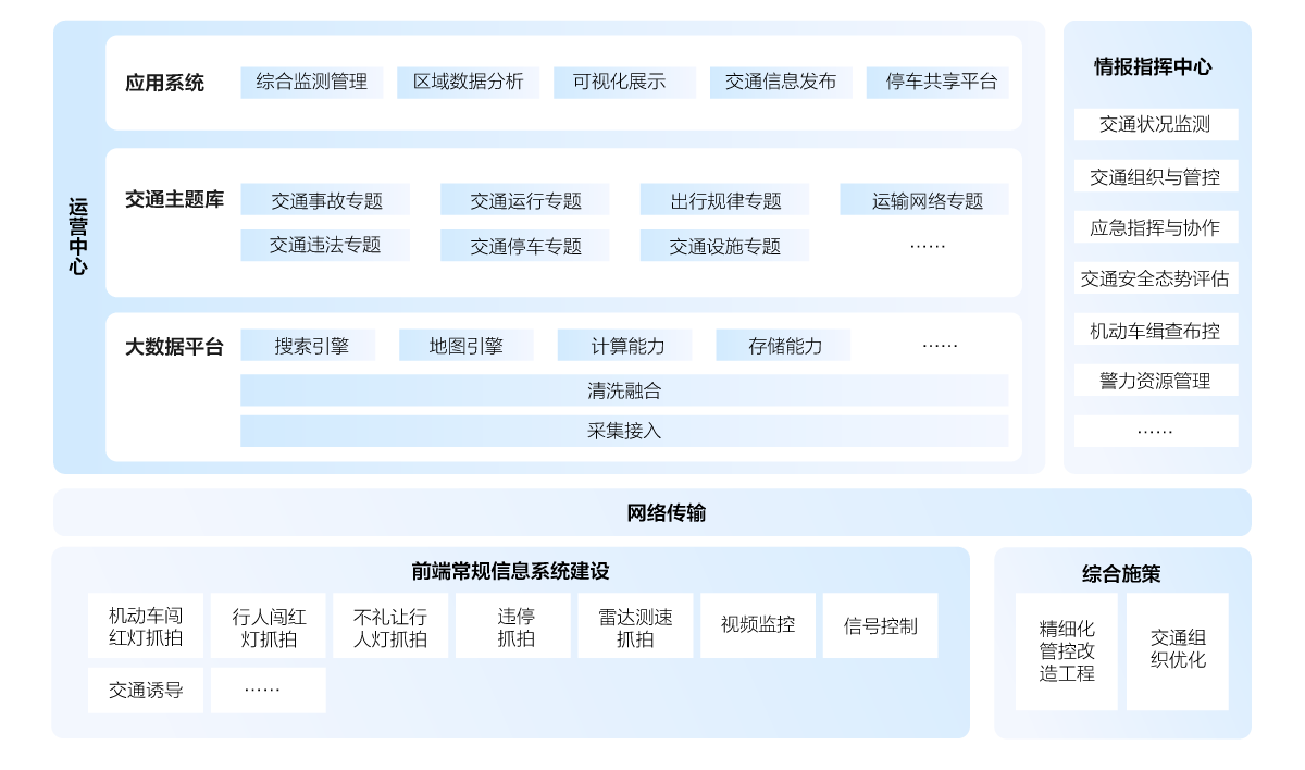 智慧交通建設(shè)分為情報(bào)指揮中心、交通平臺(tái)、