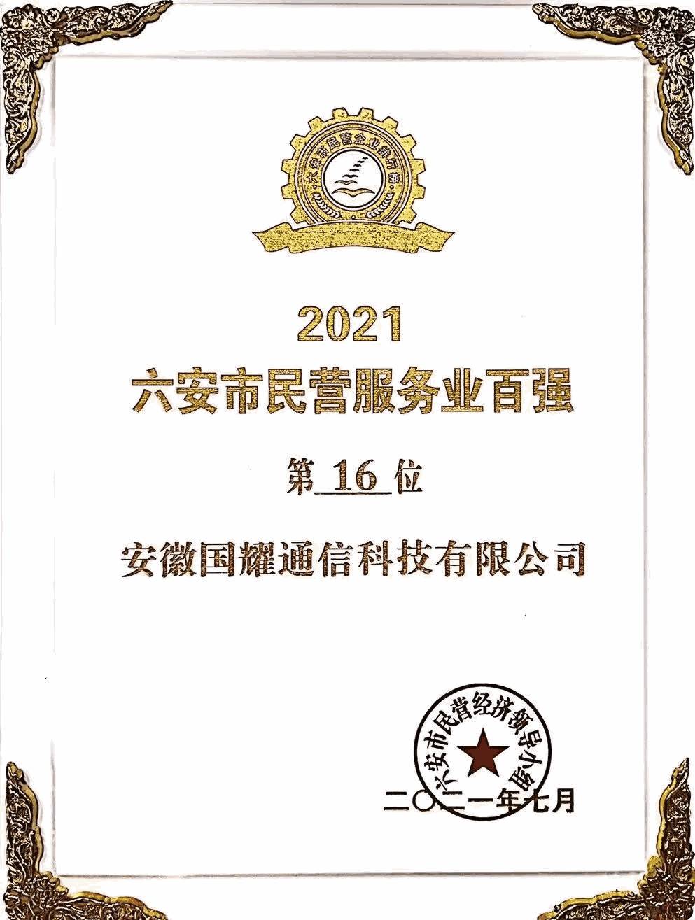 熱烈祝賀安徽國耀通信科技有限公司榮獲“2021六安市民營服務(wù)業(yè)百強(qiáng)”光榮稱號(hào)